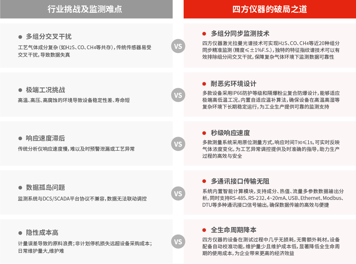 在石油化工行業(yè),氣體監(jiān)測的細微偏差如同暗流——傳統(tǒng)設(shè)備的數(shù)據(jù)滯后、抗干擾弱、環(huán)境耐受性不足,讓生產(chǎn)波動與安全隱患始終蟄伏于毫厘之間。非計劃停機導(dǎo)致的單日百萬損失、流量計量偏差造成的萬噸級原料浪費、氣體泄漏觸發(fā)的連鎖事故,不斷侵蝕企業(yè)利潤與安全底線。四方儀器以“多組分 · 高精度 · 快響應(yīng) · 高穩(wěn)定”四重革新破局,不僅解決數(shù)據(jù)盲區(qū),更將監(jiān)測價值錨定于停機率歸零、單耗成本銳減、產(chǎn)能彈性釋放的硬指標,重構(gòu)過程氣體管控的行業(yè)基準。